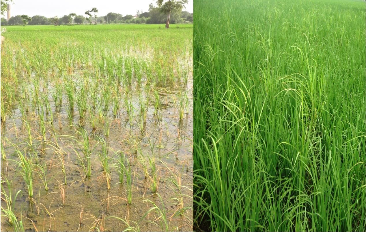 Infected plants are abnormally taller and lanky than the healthy plant.