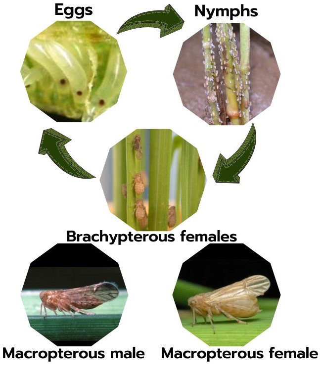 Macropterous forms are the first to appear in the newly planted field and begin colonization. They lay less number of eggs while brachypterous females lay about 300-500 eggs. Eggs are inserted in the tissue of the lower part of the rice plant, mainly near midrib of leaf sheaths and also in leaf blades. The eggs are covered with a dome shaped egg plug secreted by the female. Only the tips of eggs are seen on the plant surface. Eggs are banana-shaped and newly laid eggs are whitish; turn darker when about to hatch. Before hatching, two distinct eye spots appear on the egg. Egg period ranges between 7-11 days. The nymph has triangular head with a narrow vertex. Its body is creamy white with a pale brown tinge.