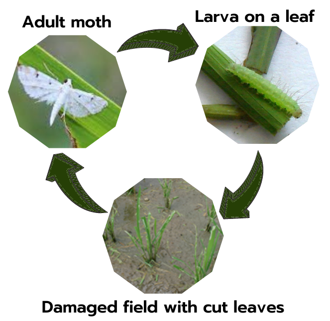 The caseworm occurs only in rice fields with standing water. Larvae begin to feed shortly after hatching and start making leaf cases two days later. The freshly hatched larvae feed on the surface of the tender leaves, but later instars feed from within the case or on the surface of even the older leaves. Damage is caused by larvae feeding and cutting off the leaf tips for making leaf cases. Damage is characterized by ladder-like appearance of the removed leaf tissue, leaving the upper epidermis somewhat papery. Damaged plants occur in patches in the field. Heavily infested plants may still recover within a month, but are already stunted, produce fewer tillers and smaller panicles, and maturity is delayed.