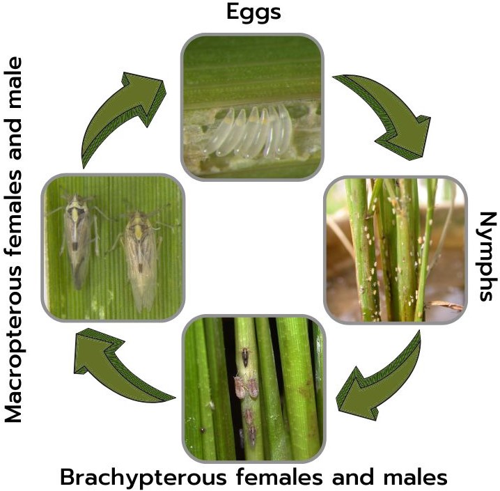 They reach adulthood in 12-17 days passing through five instars. Total life cycle is completed in about 29 to 54 days. Adult hopper has a prominent white band between the junctions of the wings. The body is creamy white with the mesonotum and abdomen black dorsally and the legs ochraceous brown.