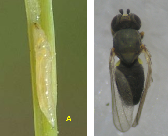 The maggots feed on the inner margins of the unfurled leaves. The newly hatched larvae migrate to the central whorl and feed on the mesophyll tissue. Damage is characterised by small, chewed-up, discoloured areas on the innermost margin of the central whorl. These areas eventually dry up and damaged leaves usually droop. Severely damaged fields show discoloured, constricted leaves Heavy infestation causes a marked stunting of the plant, fewer tillers, and delayed panicle initiation and maturity.